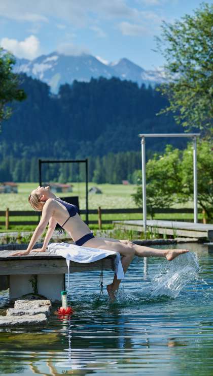 Frau entspannt am Naturteich PanoramaQUELL im Wellnesshotel l in Oberstdorf
